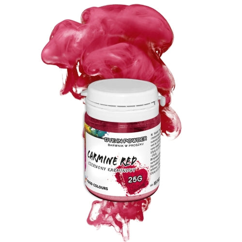 Barwnik spożywczy w proszku Carmine Red Karminowy barwnik spożywczy w postaci proszku. Tradycyjny, najmocniej skoncentrowany barwnik syntetyczny w proszku. Jest bardzo wydajny, zapewnia intensywne wybarwienie nawet przy minimalnych dozach! Można go zastosować do wszystkich produktów zawierających wodę. Rozpuszczalny w wodzie, alkoholu, glikolu i glicerynie. Nie rozrzedza i nie zmienia konsystencji ciasta. Nie nadaje się do mas tłustych.</p><p>Barwniki w proszku syntetyczne Szeroka gama kolorystyczna tradycyjnych barwników w proszku od Food Colours o mocnych, intensywnych kolorach. Wyróżniają się największą koncentracją spośród wszystkich dostępnych na rynku barwników w proszku. Do stosowania w środowiskach wodnych. Bardzo szerokie zastosowanie: do masy cukrowej, kremów śmietanowych, płynów, soków, galaretek, dżemów, ciast, polew, dekoracji, lukru królewskiego czy marcepanu.</p><p>Barwnik w proszku: jak używać? Przed barwieniem należy rozrobić barwnik w małej ilości masy i dokładnie wymieszać, aby nie było widać cząstek barwnika. Można użyć miksera lub łopatki silikonowej. W przypadku niedokładnego wymieszania nawet po czasie mogą pojawić się kropki nierozpuszczonego barwnika. Pod dokładnym wymieszaniu wprowadzić w resztę masy. Wyjątkowa wydajność wymaga pewnego doświadczenia w dozowaniu. Przydatne mogą być wagi laboratoryjne do 0,1 mg. W warunkach domowych można użyć do dozowania końcówki noża. Pył barwnika jest bardzo lotny, należy uważać podczas używania. Po wymieszaniu z małą ilością alkoholu lub wody można malować po lukrze, lub marcepanie jak farbką.</p><p>Właściwości barwnika Food Colours: Kolor: czerwony, karminowy, carmine red Skoncentrowany barwnik w proszku Spożywczy: barwnik jest jadalny Rozpuszczalny w wodzie Opakowanie: plastikowy pojemnik Waga netto: 25 g</p><p>Skład: azorubina E122.</p><p>Przechowywane: w suchym, chłodnym i zacienionym miejscu. Barwnik jest higroskopijny i traci właściwości w niedokładnie zamkniętym opakowaniu.