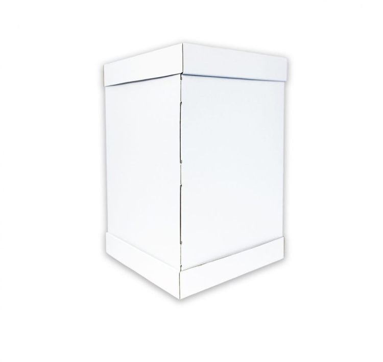 Pudełko o wymiarach 30x30x45 cm w formie obwoluty oraz wieka górnego i dolnego. Karton nadaje się do zapakowania i transportu wysokiego tortu.