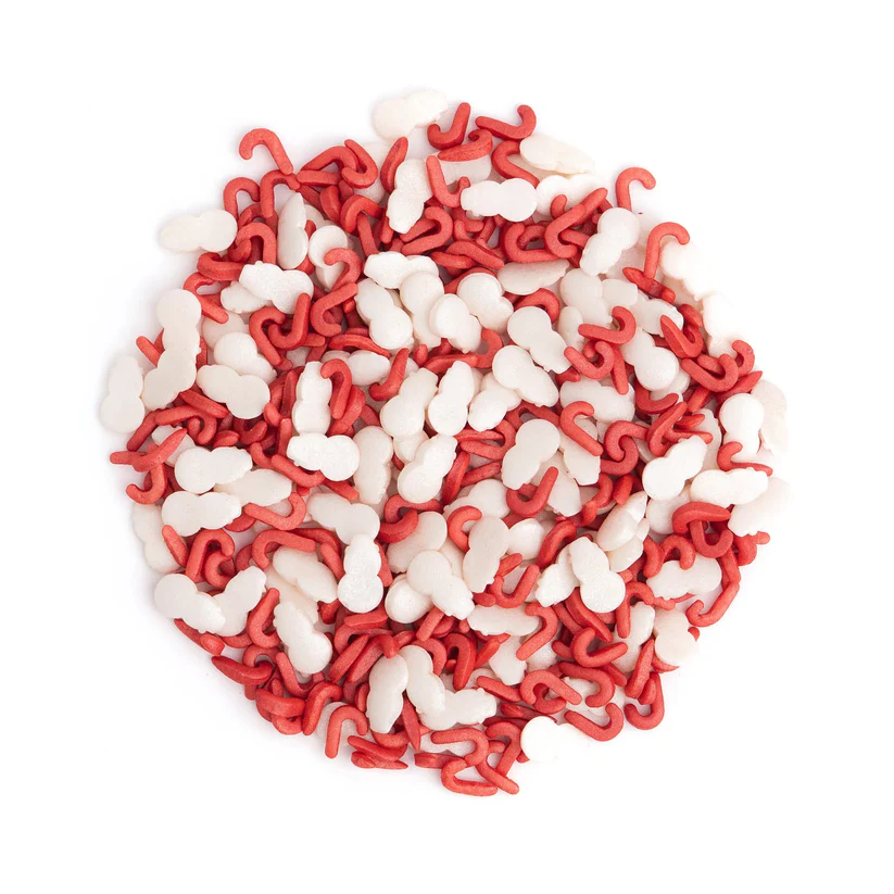Cukrowa posypka złożona z białych bałwanków i czerwonych lasek cukrowych to klasyczne świąteczne połączenie!