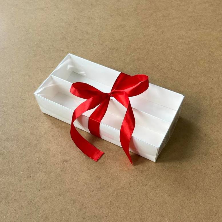 Pudełko z tektury laminowanej z przezroczystą pokrywą z politereftalanu etylenu o wymiarach 210x100x50 mm. W zestawie znajduje się zakładka dzieląca pudełko na cztery podłużne przekroje. Można używać zarówno z zakładką, jak i bez niej. Nadaje się do makaroników, ciastek, marmolady, pasteli, pianek marshmallow i innych rodzajów deserów.