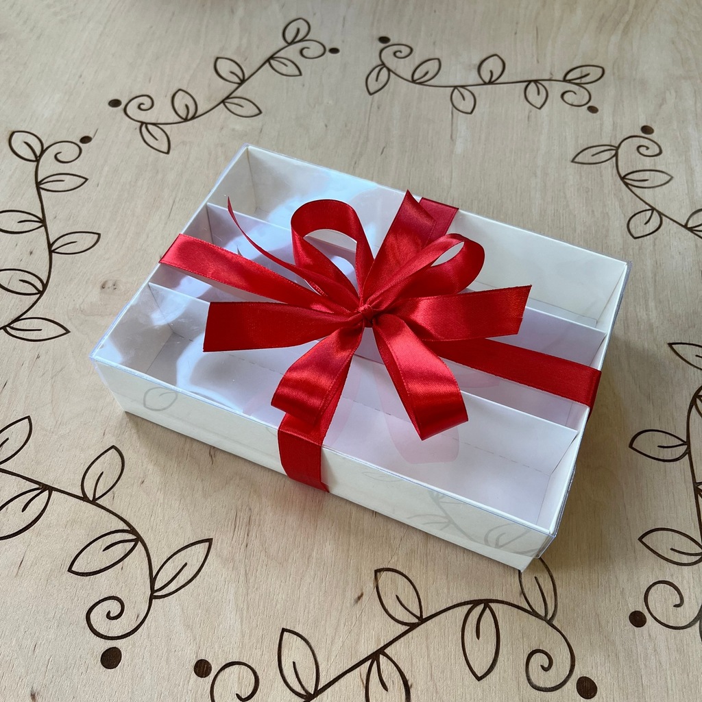 Pudełko z tektury laminowanej z przezroczystą pokrywą z politereftalanu etylenu o wymiarach 210x150x50 mm. W zestawie znajduje się zakładka dzieląca pudełko na cztery podłużne przekroje. Można używać zarówno z zakładką, jak i bez niej. Nadaje się do makaroników, ciastek, marmolady, pasteli, pianek marshmallow i innych rodzajów deserów.