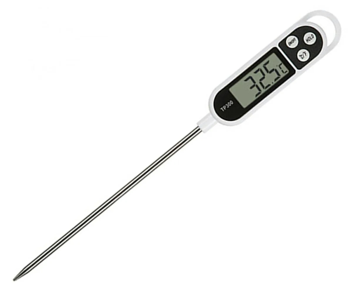 Termometr elektroniczny szpilkowy. Doskonale nadaje się do mierzenia temperatury mięsa, ciasta, mleka czy nawet herbaty. Termometr pozwala na wygodną kontrolę temperatury dowolnego produktu. Nieoceniony gdy nie chcesz przypalić / nie dopiec ciasta lub pieczeni.UWAGA: Termometru nie wolno piec w piekarniku!</p><p>Cechy i specyfikacja produktu: Produkt fabrycznie nowy, wysokiej jakości. Wyposażony w długą igłę ze stali nierdzewnej zakończoną czujnikiem temperatury. Duży i bardzo czytelny wyświetlacz LCD do odczytywania temperatury. Funkcja HOLD Automatyczne wyłączanie w celu oszczędności energii po 15 minutach Materiał: tworzywo sztuczne Zasilanie: 1x bateria AG13 (w zestawie) Zakres temperatur: od -50 do 300 stopni C (+/- 1) Jednostki: C, F Długość igły: 14,3 cm Długość całkowita: 24,3 cm Kolor: szar